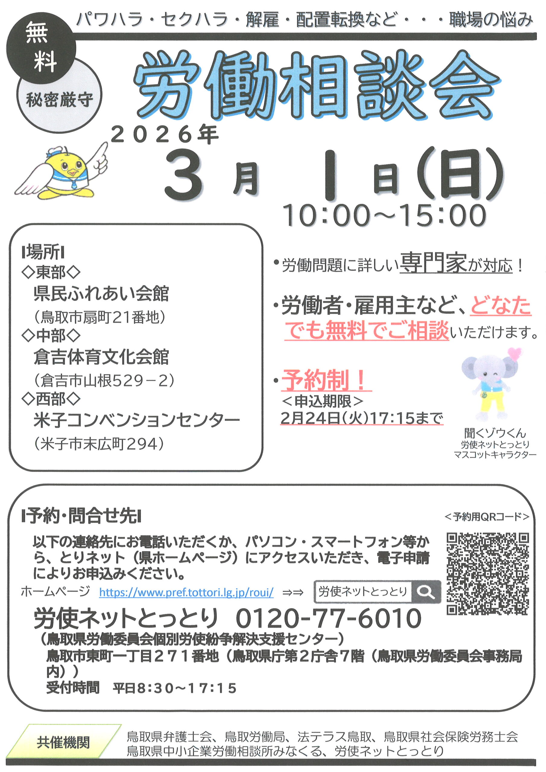 3/1(日)『日曜労働相談会(無料)』のご案内(労使ネットとっとり)