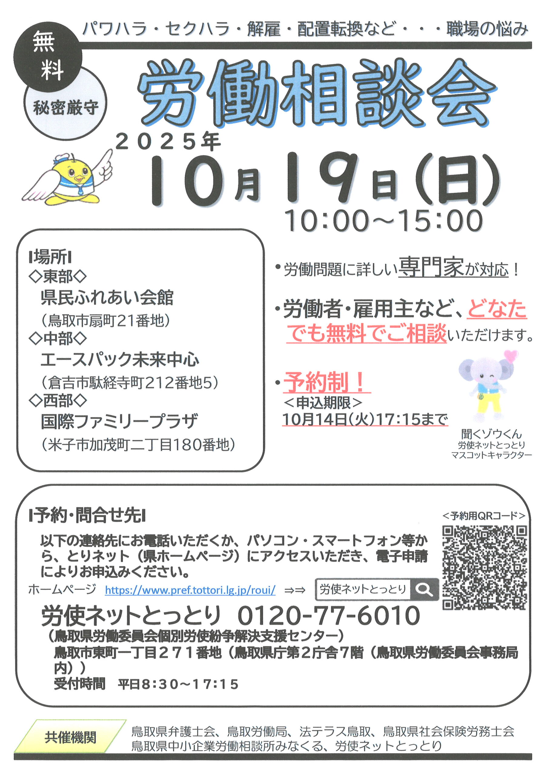 10/19(日)『日曜労働相談会(無料)』のご案内(労使ネットとっとり)