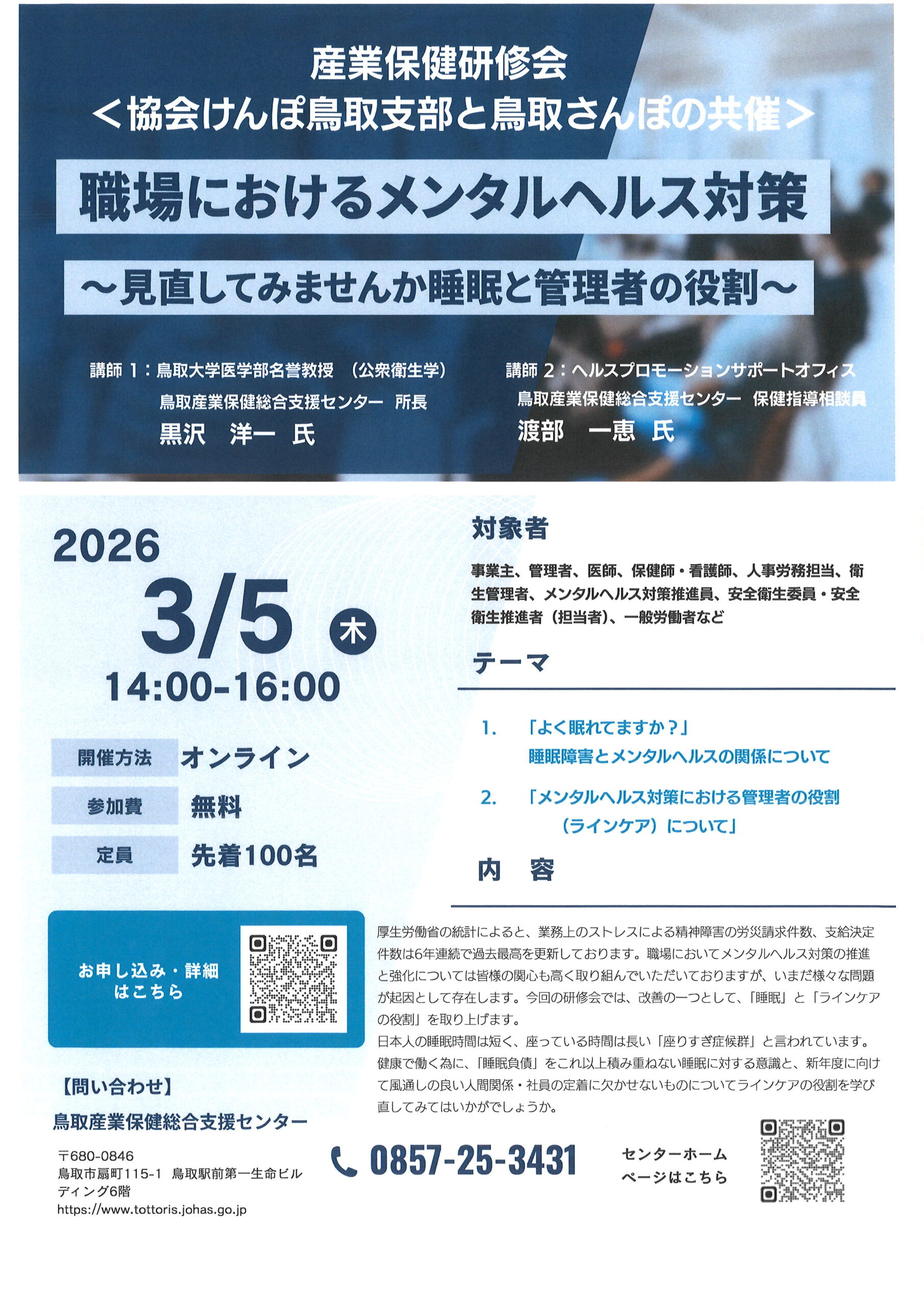 鳥取産業保健総合支援センターと全国健康保険協会鳥取支部では、この度共催で、メンタルヘルス対策における睡眠の重要性、管理監督者にメンタルヘルス対策での役割を理解していただくための研修を行います。皆さまの職場におけるメンタルヘルス対策推進のために、ぜひご参加ください。 - 対 象: