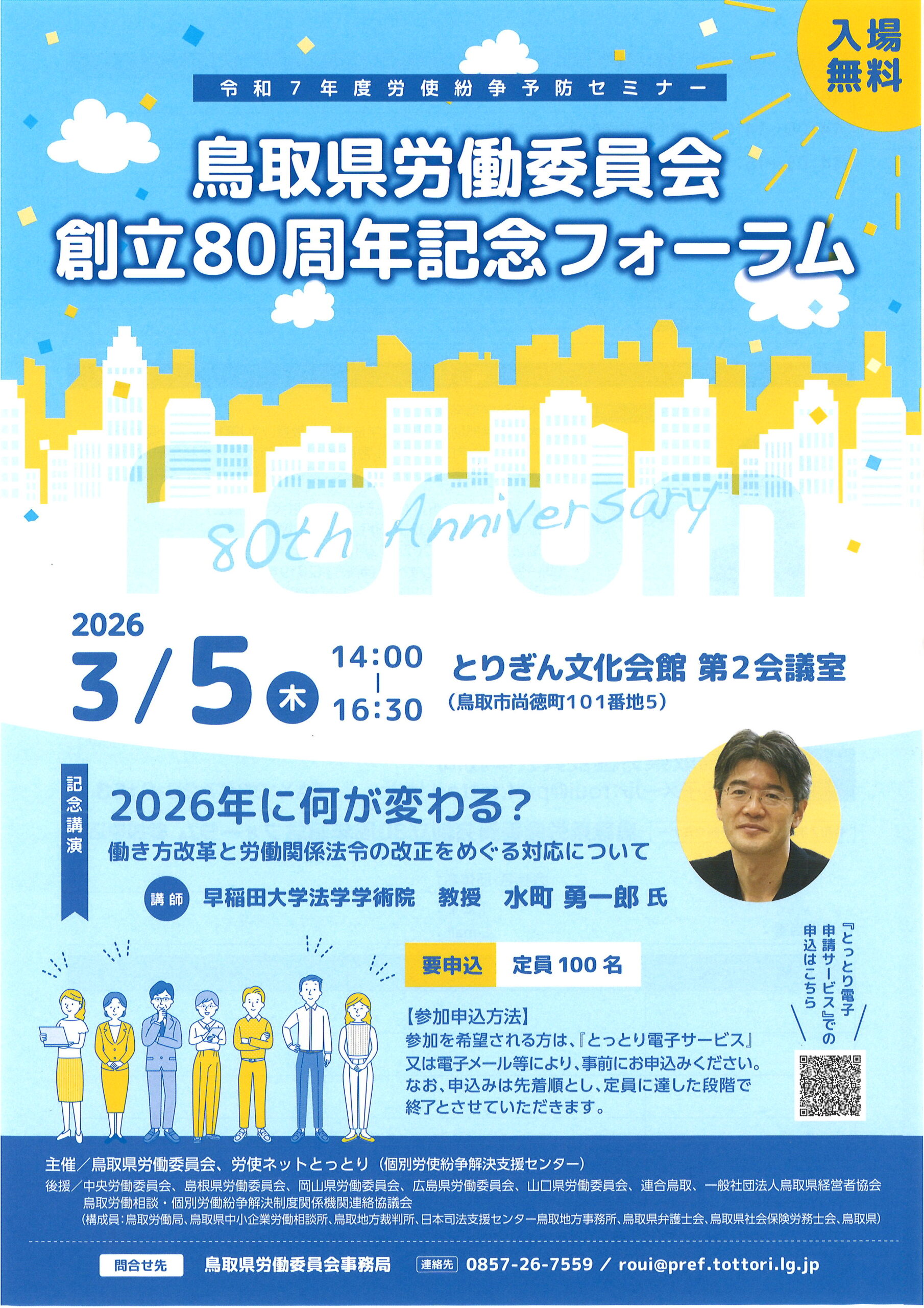 労使ネットとっとり(鳥取県労働委員会 個別労使紛争解決支援センター)では、本年3月に本県労働委員会創立80周年を迎えることを記念し、フォーラムを開催されます。
